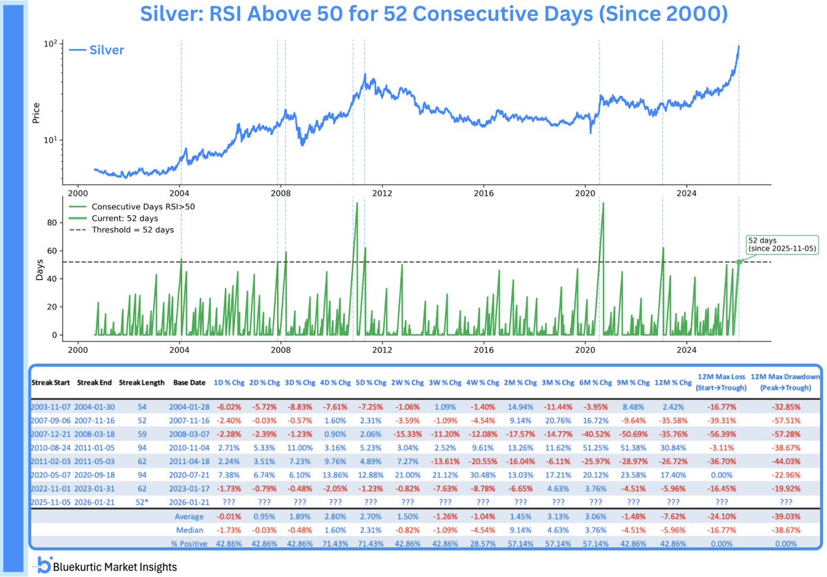 Voor de korte termijn kan de prijs sterk bewegen. Dat hoort erbij. De RSI van zilver staat al bijna 2 maanden onafgebroken boven de 50. Dat is de 8e langste reeks sinds 2000.