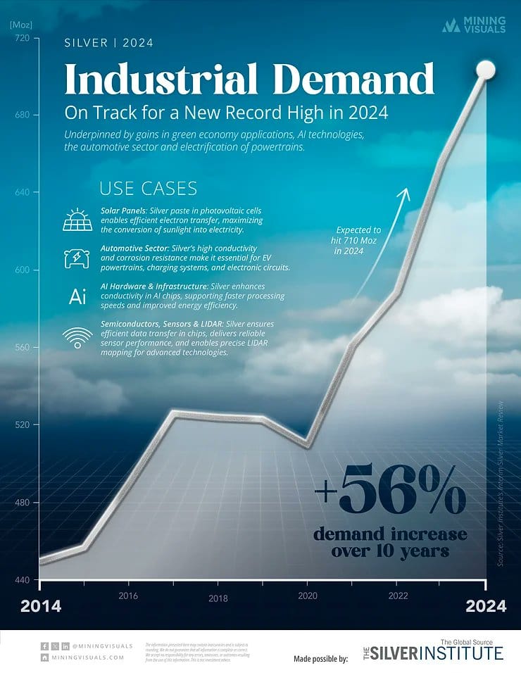 Dat betekent dat een verdubbeling, verdrievoudiging of misschien zelfs vervijfvoudiging van de zilverprijs geen rem zet op de vraag.