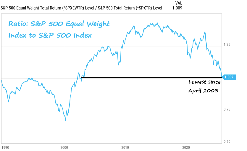 Het is dus een kleine groep die het grootste deel van het rendement drijft, met hoog oplopende waarderingen. Het gevolg hiervan is dat de verhouding tussen de gelijk gewogen S&P 500 en de reguliere S&P 500 het grootst is in meer dan 20 jaar.