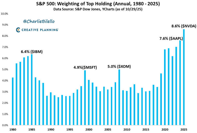 Dat komt doordat er sprake is van een extreme mate van concentratie. We vonden hier een aantal interessante grafieken over, die dit goed visualiseren. Neem bijvoorbeeld de weging van het grootste bedrijf uit de S&P 500. Dat is momenteel NVIDIA met 8,6%. Nog nooit had één bedrijf zo’n zware weging in de index.