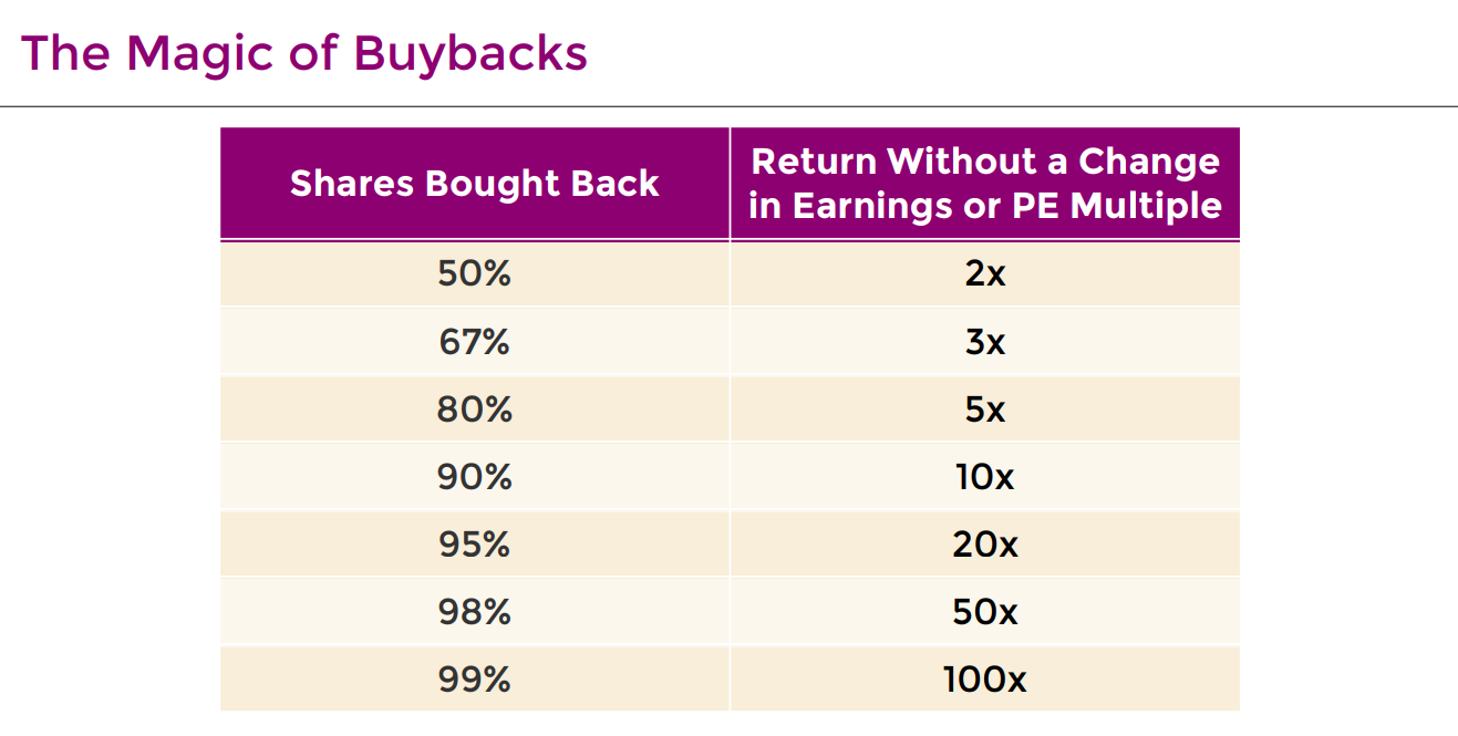 Wanneer een bedrijf 50% van zijn eigen aandelen inkoopt, verdubbelt het rendement per aandeel, zelfs zonder dat de winst stijgt of de waardering verandert. Bij 67% inkoop wordt dat rendement verdrievoudigd.