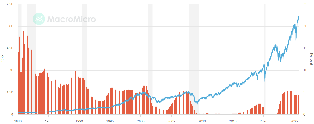 Beleidsrente (oranje) en verloop S&P 500 (blauw) sinds 1980