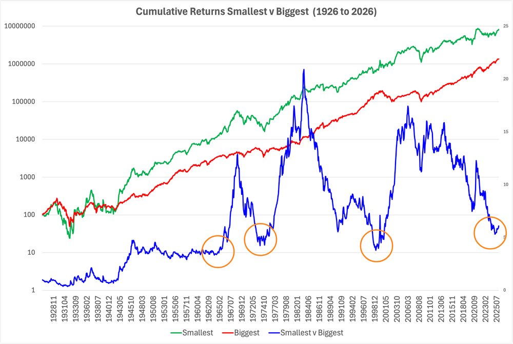 Beurscycli zijn langgerekt en voortdurend in beweging, en een van de meest fascinerende voorbeelden hiervan is de verhouding tussen de grootste en de kleinste aandelen op de markt.
