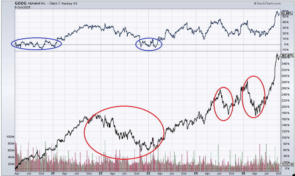 Want ondanks schommelingen en correcties steeg Google in vijf jaar tijd met +350%, ofwel gemiddeld +35% per jaar.