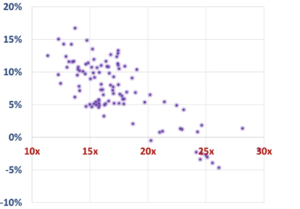 De relatie tussen de waardering van de index, en het rendement dat daaruit voortvloeide, vind je in de grafiek hieronder. Het mooie is dat dit op basis van een zeer eenvoudige waarderingsmethode toch goede resultaten oplevert. Hier is de ‘forward P/E’ gebruikt, ofwel de winst van de totale index die analisten verwachten voor het toekomstige jaar. Dit is afgezet tegen het jaarlijkse rendement dat de index leverde in de tien jaar die daarop volgde.