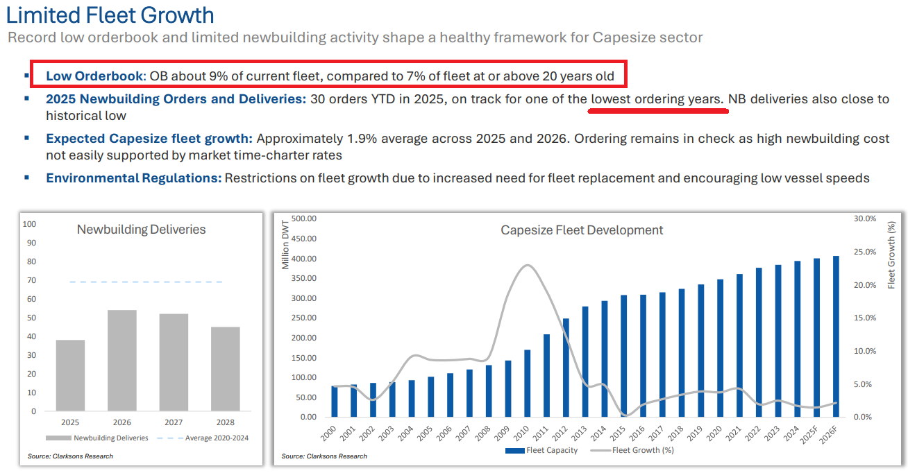 Het orderboek voor nieuwe Capesize-schepen bedraagt ongeveer 9% van de bestaande vloot. Dat is historisch laag. Een aanzienlijk deel van de vloot is bovendien verouderd.