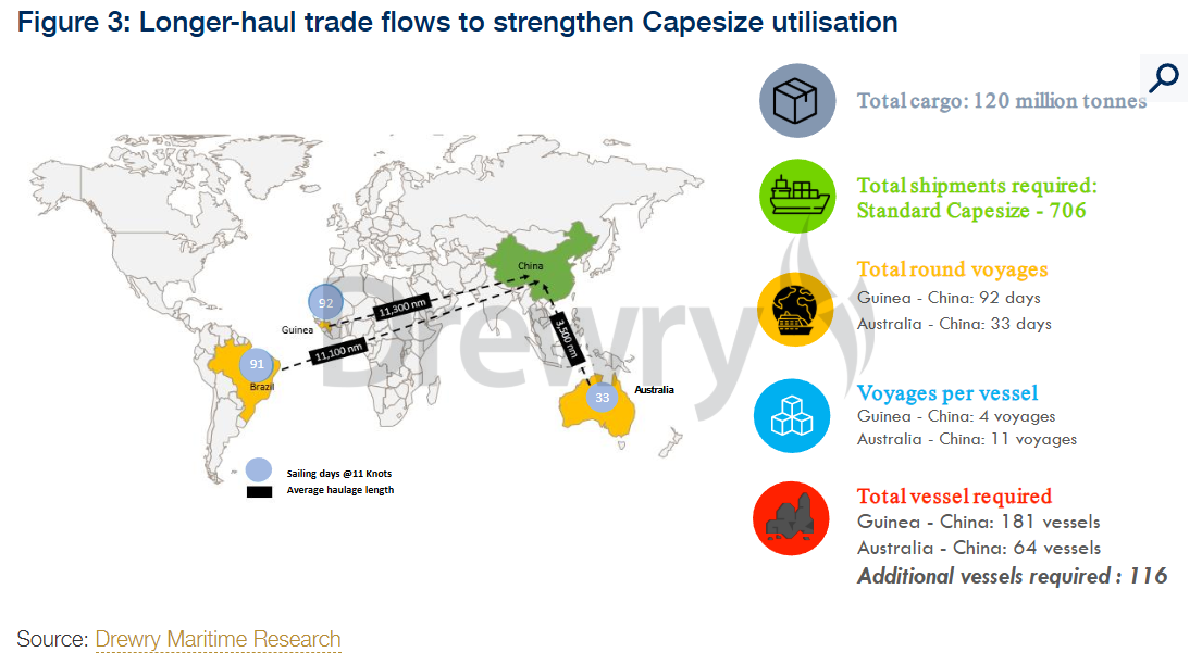 Elke ton uit Guinee houdt dus een schip drie keer langer bezet dan een ton uit Australië. Zelfs als de wereldwijde staalvraag niet groeit, zuigt deze verschuiving capaciteit uit de markt.