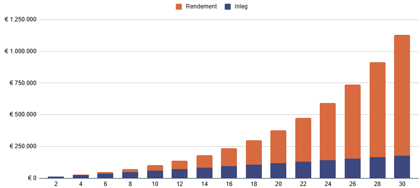Stel dat je per maand € 500 investeert, en een rendement van 10% per jaar boekt. Het doel is om een portfolio van € 1 miljoen te bereiken, om vervolgens te leven van het rendement. Hieronder zie je het verloop van het portfolio, met de investeringen in het blauw en de groei vanuit het rendement in het oranje.