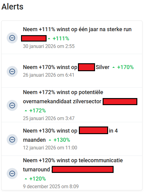 We namen +120% winst op een telecomaandeel dat niemand nog op zijn radar had. We verkochten een toen nog onbekend ruimtevaartaandeel met +130% winst. Twee keer realiseerden we +170% winst op een zilveraandeel dat jarenlang genegeerd werd.