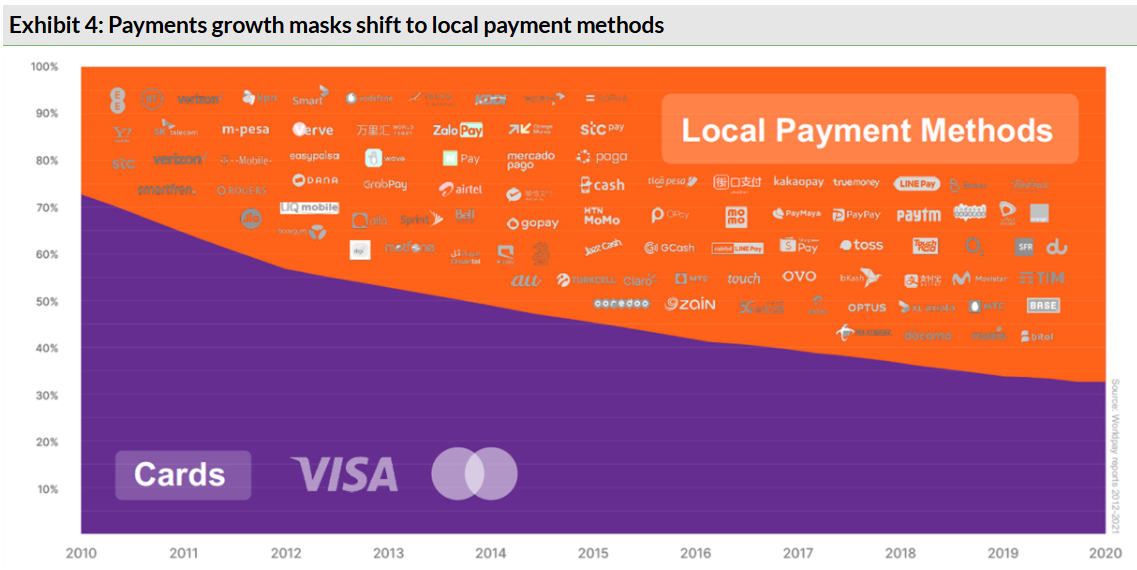 Vergelijk dit eens met de lievelingen van de beurs. Adyen en Checkout.com zijn fantastisch, maar zij leunen volledig op het ecosysteem van Visa en Mastercard.
