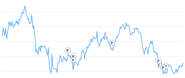 Koersverloop over het afgelopen jaar, en Insiders (de P’s) die de dip kopen