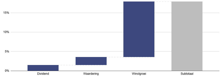 De aanname is dat de beurs na deze rally wel heel duur moet zijn, en dat er dus snel een correctie moet volgen. Wanneer we inzoomen op de herkomst van dit rendement, zien we echter iets opvallends. Zoals altijd zijn er namelijk slechts drie factoren die het rendement bepalen: