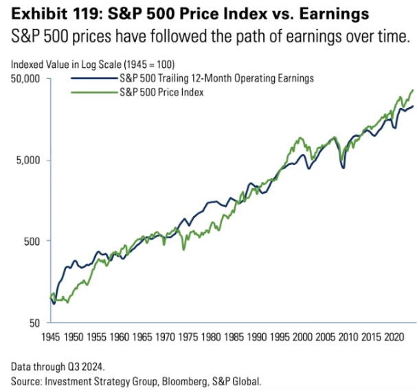 In onderstaande grafiek zie je hoe hand in hand deze twee factoren gaan. Sommige jaren wordt de beurs wat duurder, en sommige jaren koelt de waardering wat af. Maar op de lange termijn volgt de index de winst van de onderliggende bedrijven.